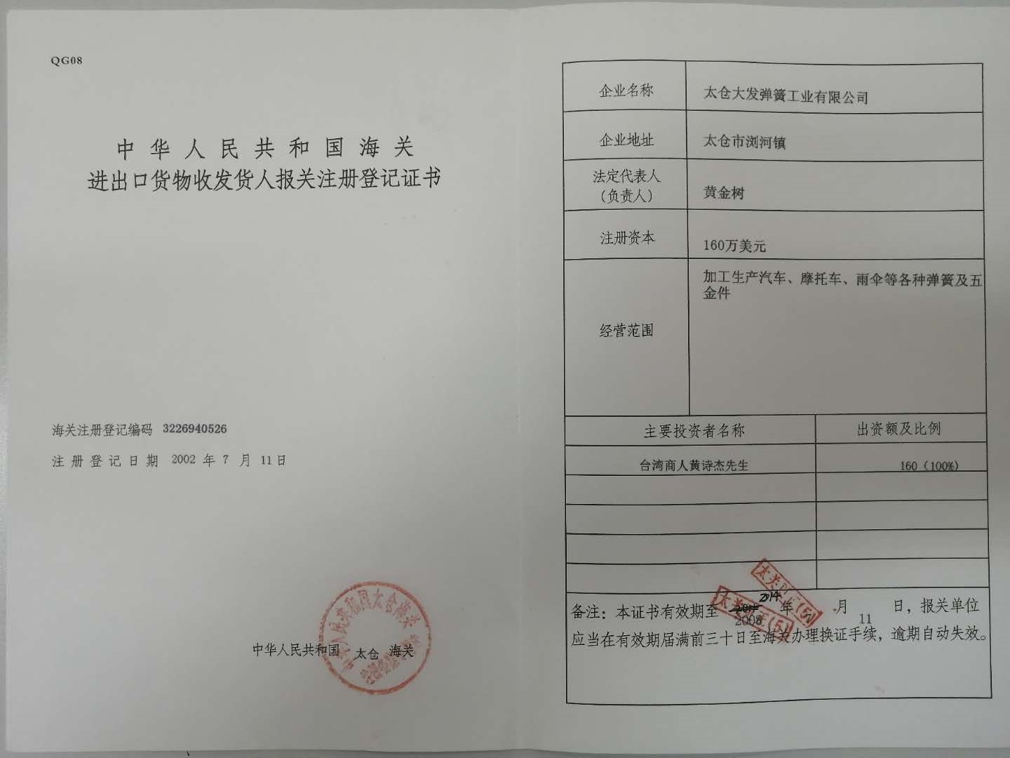 太倉大發(fā)彈簧工業(yè)有限公司由黃金樹先生于1967年始創(chuàng)于臺灣,是一個集雨傘、電子、五金機械、自行車、摩托車、汽車等的彈簧配件生產(chǎn)、加工、輔助設(shè)計服務(wù)的綜合性企業(yè),其中1990年創(chuàng)辦的廈門大發(fā)彈簧公司、2000年創(chuàng)辦的深圳大發(fā)彈簧公司、2002年創(chuàng)辦的太倉大發(fā)彈簧公司均位于經(jīng)濟發(fā)展地區(qū),地理位置佳。我們憑借在彈簧制造業(yè)的多年豐富知識與技術(shù),并著眼于以客戶為導(dǎo)向,秉持“以人為本,以質(zhì)為先,以客為主,持續(xù)創(chuàng)新”的經(jīng)營理念,強化競爭優(yōu)勢。公司導(dǎo)入ISO9001: 2000質(zhì)量管理體系,執(zhí)行ISO14000:2000管理方式,倡導(dǎo)安全、高質(zhì)量、高素質(zhì)的生產(chǎn)。
